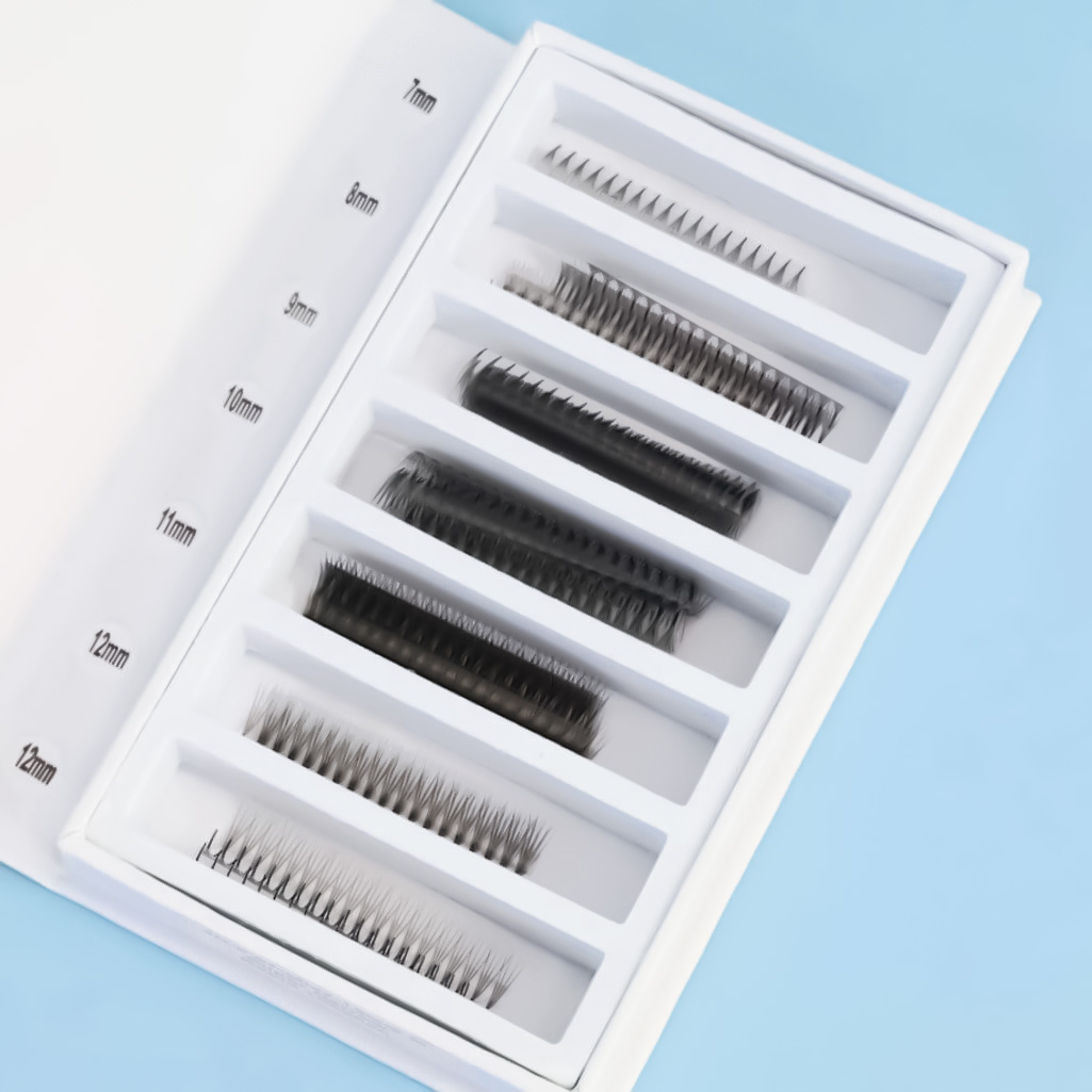 The symmetry of the pre-made fans is uniform, with each fan being identical. The attachment point of the fan is short to achieve a beautiful final result. The lash tray contains varying lengths from 7-12 mm and 1000 fans. Available options include C, CC, D,M and L mix trays.