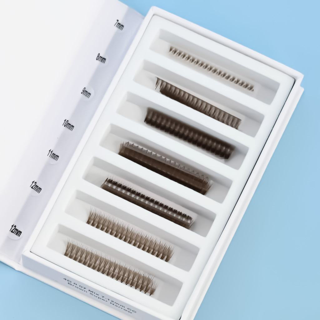 The lash tray contains varying lengths from 7-12 mm and 1000 fans. Available options include C, CC and D mix trays.