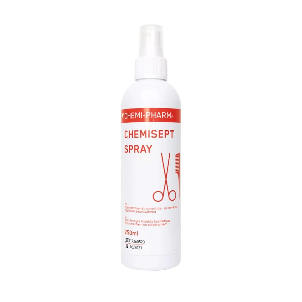 Chemisept Spray soveltuu alkoholinkestäville instrumenteille ja kosmetiikkatarvikkeiden desinfiointiin. Puhdistusaineella on laaja ja nopea vaikutus mikro-organismeja vastaan, vaikutusaika 30 sekuntia. Sisältää glyseriiniä suojaamaan instrumentteja ja pidentämään tarvikkeiden käyttöikää.
